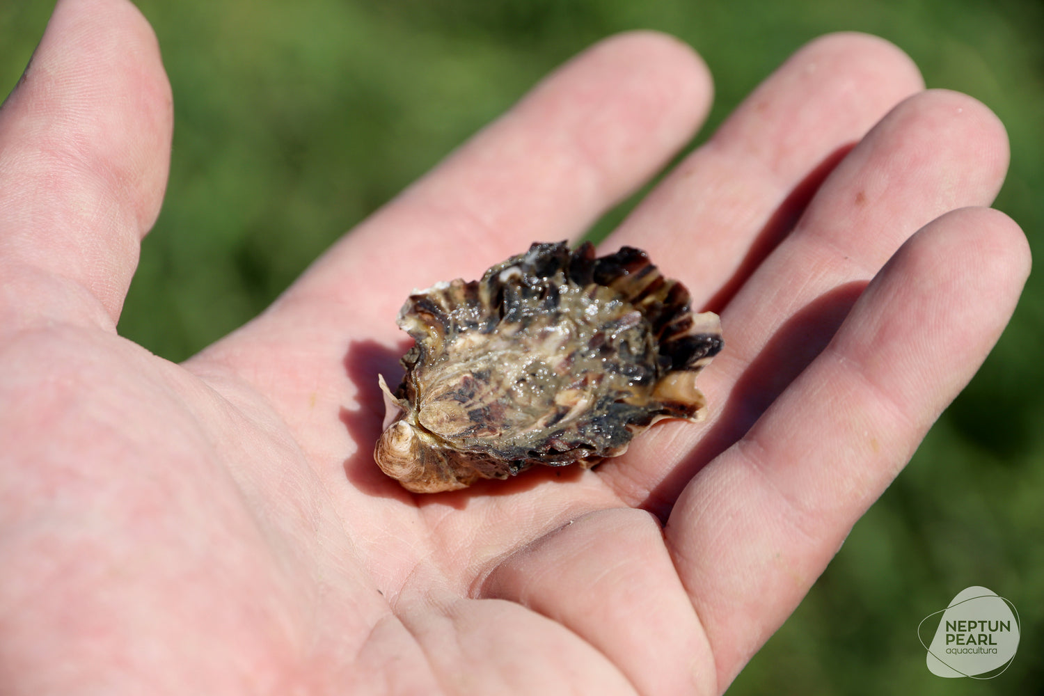 Recepcionamos as ostras oriundas ecloserias de renome com 4 a 6 mm de largura, 150 mg e colocamo-las em sacos de rede fina com flutuadores que os mantêm na superfície da água iluminada pelo sol, no meio do fitoplâncton rico em nutrientes de que necessitam para crescer.